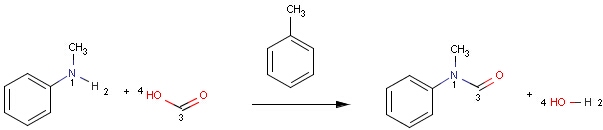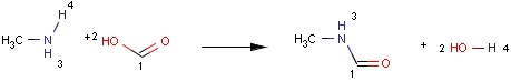 Structures to the left of the reaction arrow are reactants (starting materials), structures to the right of the reaction arrow are products, and those molecules drawn just above or below the arrow are agents (ingredients). Corresponding atoms containing changing bonds (created, destroyed or modified) are marked with map numbers both in the reactants and in the products (Table 1.).