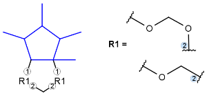 R-groups (also referred to as "substituent variation") are the most widely known Markush generic features. The variable part of the structure is denoted by an R-atom (e.g., R1), and the definitions are given separately. In each definition, the connection points must be defined to show where the bonds of the R-atom are linked. R-atoms can appear in both rings and chains. The same R-atom can appear multiple times, and the different occurrences are handled as different cases. (So they can be substituted with different definitions.) R-logic is not supported. R-group nesting in R-group definitions is allowed to any depth, but without recursion. (An R-group definition cannot use the R-atom it is defining, not even through the use of other embedding R-atom(s).) R-groups up to number R32767 can be used.