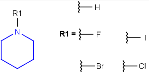 Atom lists are another example of substituent variation. They define lists of atom types at a given position. There is no restriction for the length of the list and for bond count of atom lists. (Atom list drawing in Marvin Sketch is described here.)