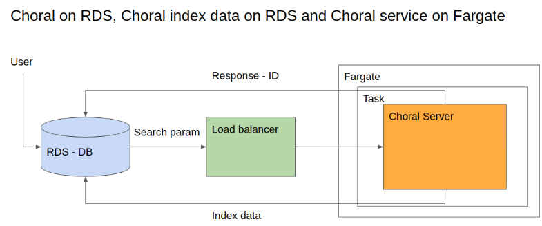 By default the index data of the Choral service is stored on the filesystem, but in case of Fargate to prevent loss of data on service failure and for easier backup the Choral service can write back the index data to the RDS database as depicted on the diagram below.