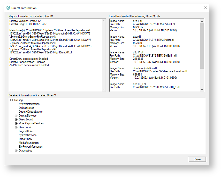 In JChem for Excel, it is possible to check the DirectX information through the About JChem for Excel dialog. This way, users can get detailed information about the used DirectX versions and the DirectX processes (dll names, versions, and so on) that are used by Excel.