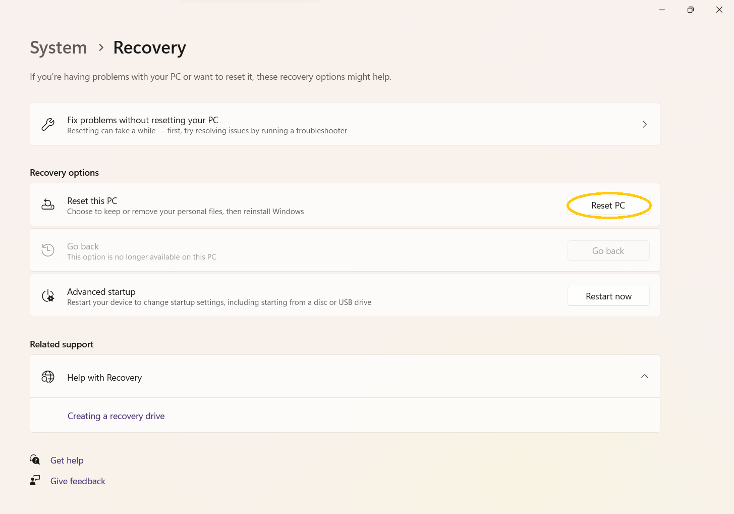 The simplest way to do the registry repair is to go to " Settings/Recovery " and press " Get started ":