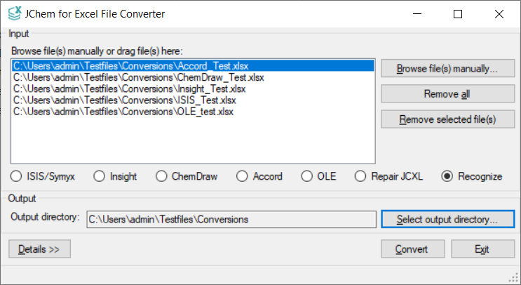 - Recognize: Recognizes types of selected workbooks and converts them to JChem for Excel workbooks. You can use this method to convert multiple workbooks with different types. If the originally selected conversion method fails for some reason, the other types will be checked as well. So, it is not necessary to specify the conversion method, but time can be saved if the other formats should not be checked.