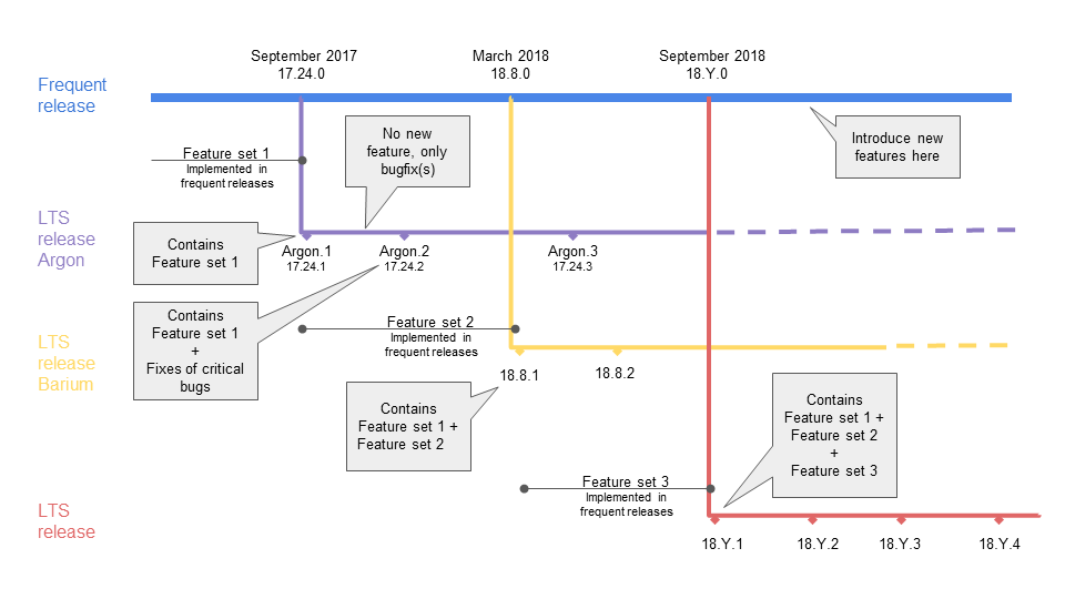 Content: Any LTS Release includes every feature and bugfixes that were published in the root Frequent Release of the actual LTS Release.