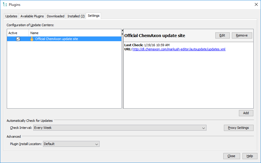 New versions of Markush Editor are released every week with new features, improvements, and bugfixes. The automatic update function periodically checks available version updates and after user confirmation downloads and installs them. Depending on user preferences automatic update can be turned off, or the inhouse update site can be used instead of the official update side of Chemaxon. Automatic Update settings are available from Tools>Plugins Settings tab.