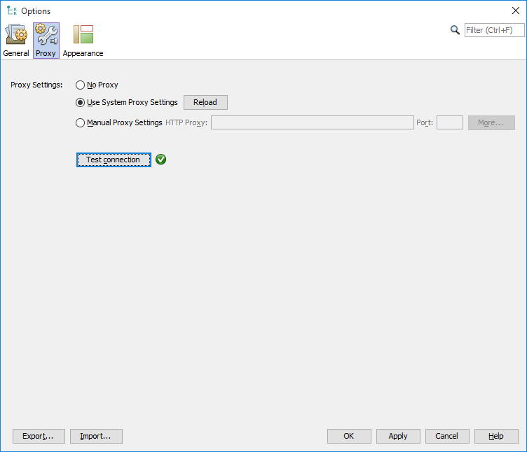 If you use the application behind a proxy server, you may need to set the proxy settings for outgoing communication. These settings are necessary for automatic updates. You can test your settings using the Test connection button. If neither of No Proxy or Use System Proxy Settings works for you, please consult your system administrator about the proper Manual Proxy Settings. Proxy settings are available from Tools>Options... General tab.