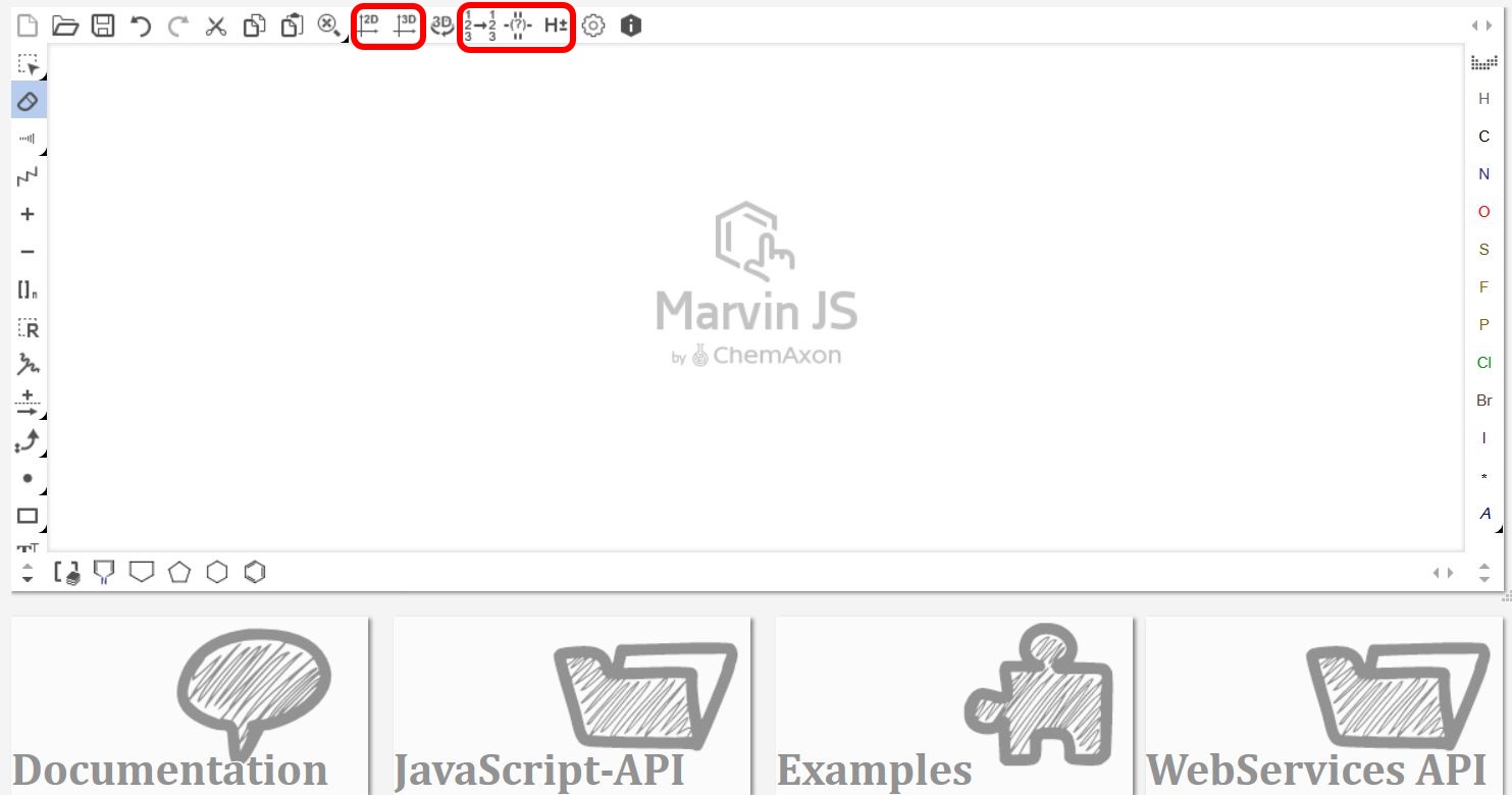 The red labeled icons below on the top toolbar of Marvin JS serve for executing structure transformations.