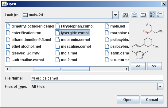 In this example, we use Marvin as a custom accessory component of a file chooser to provide a preview to molecule files.