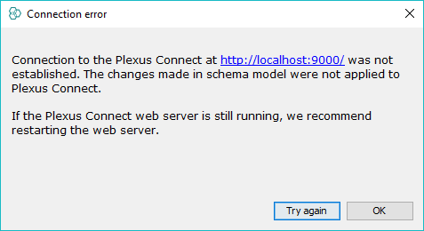 There is a "blank" time, where any changes done to the schema will not be picked up by Plexus Server. First obvious time is when Plexus Server is not running. The other time is, when Plexus Connect servlet is just starting up and is not yet fully initialised. To make sure you are aware such state, IJC will show you an information dialog. The dialog lets you either try again, or simply dismiss the dialog. If dismissed, the dialog will not appear again, until IJC is restarted again.
