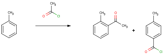 Let's look at some results of the Friedel Crafts acylation reaction performed in Reactor. This reaction acylates aromatic compounds by means of acyl halides in the presence of Lewis acids. The methyl group of toluene directs newly entering groups into ortho and para positions.