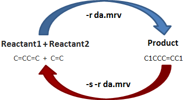 The command line parameter --reverse (-s) specifies that the reversed reaction will be performed; that is, the two sides of the given reaction equation are swapped: products are taken as reactants and reactants are taken as products. Note that in reverse mode, the number of input file(s)/string(s) should match the number of product(s) of the reaction equation to be applied.