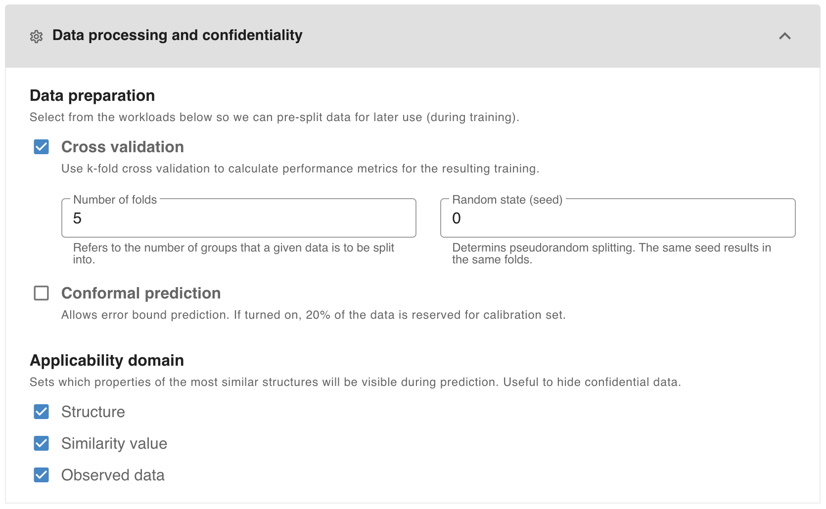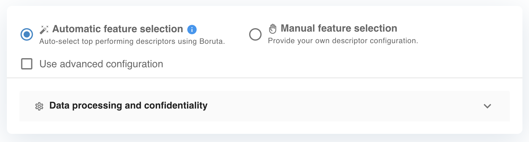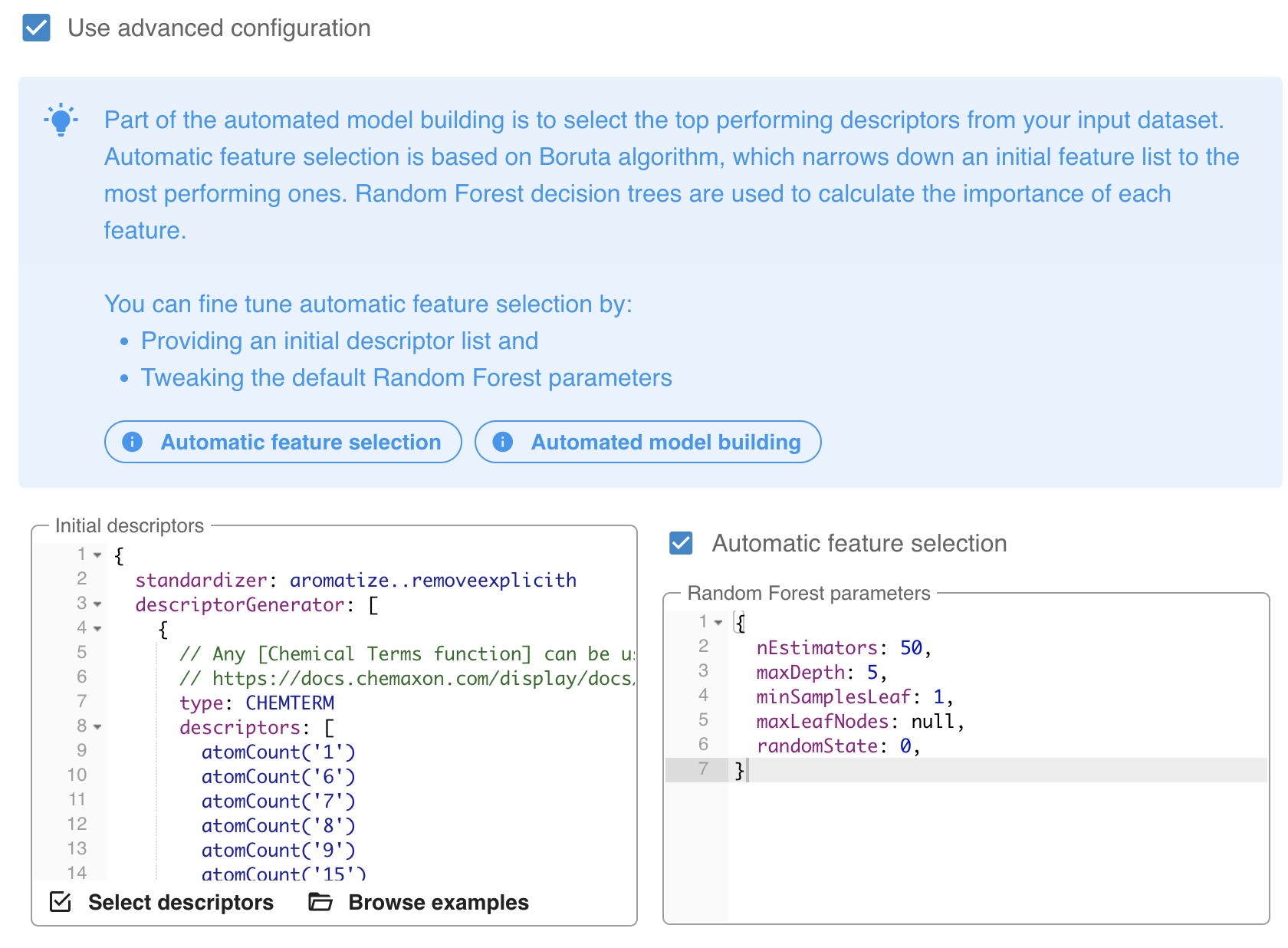 2) Automated model building uses the Boruta algorithm for descriptor selection. You can override this manually by enabling the Use advanced configuration option.