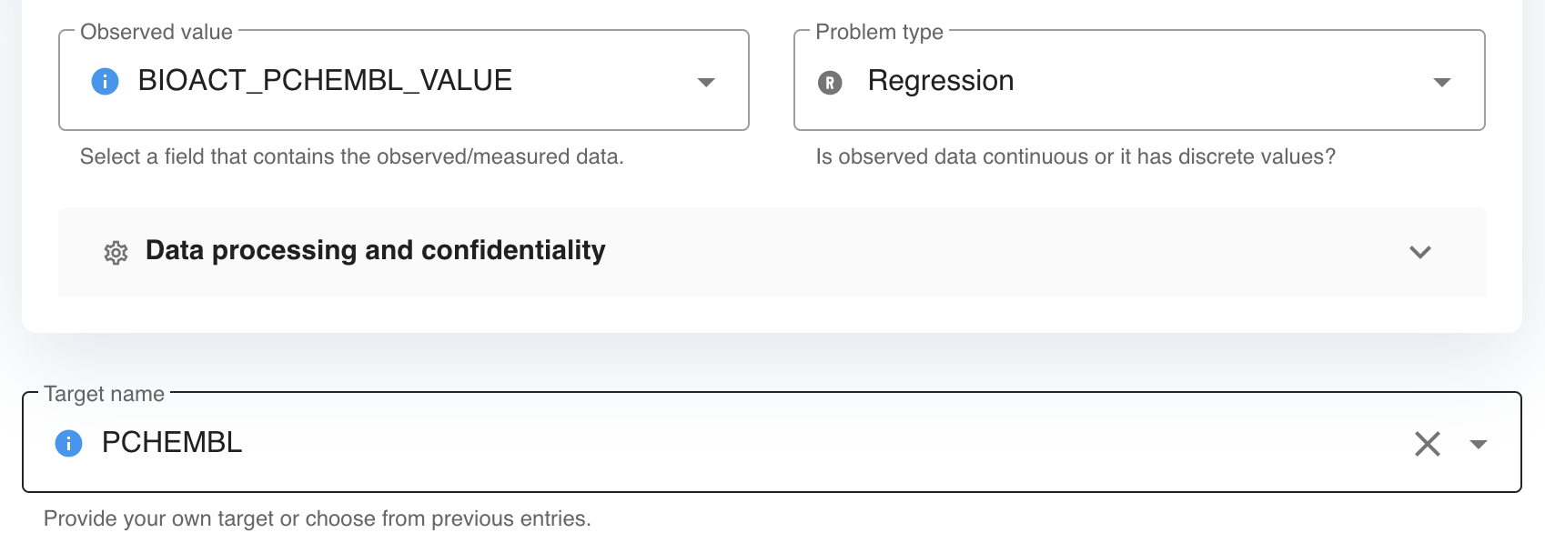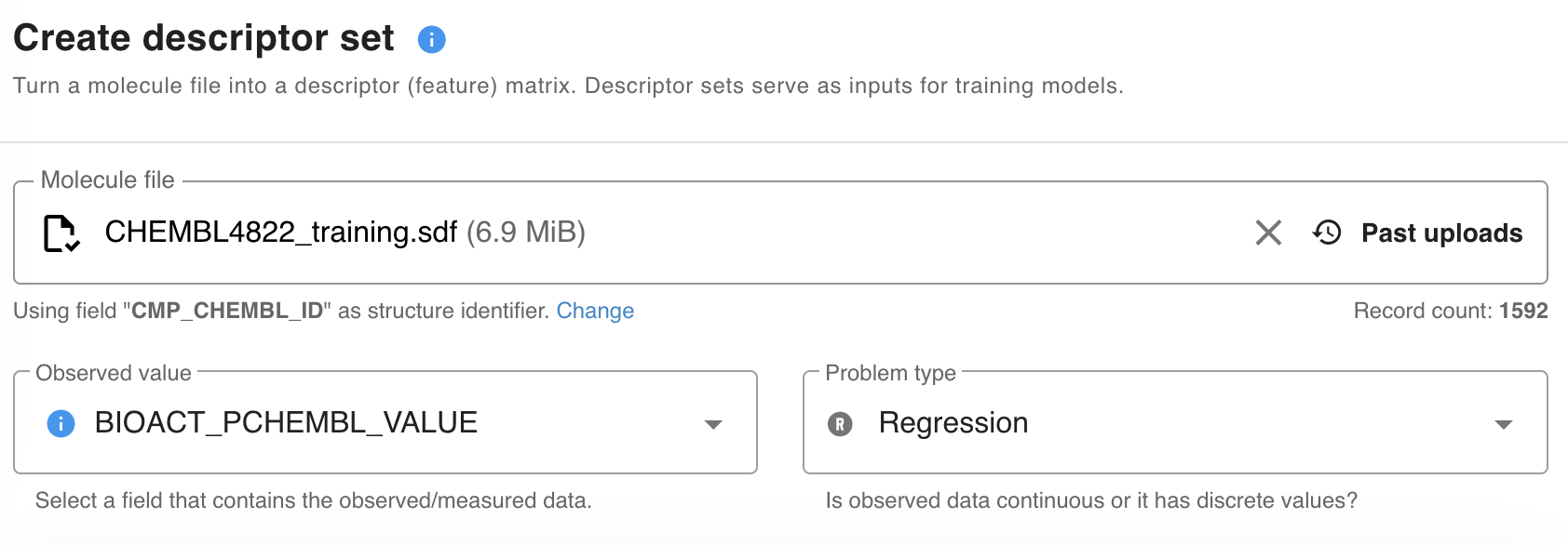 1) Upload an input file. The supported file format is .sdf, with labeled data stored in a mandatory sdf field. Also, set the Observed value, Problem type and Target name fields.