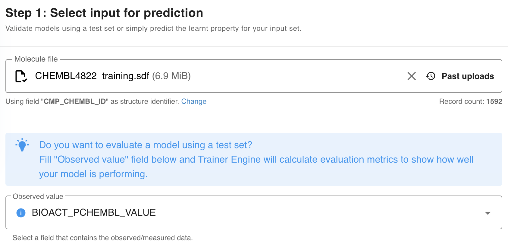 - Observed data is mandatory for training. After the .sdf file is uploaded, the identified fields are listed automatically.