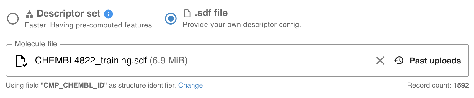 The list of previously uploaded sdf files are available by clicking on "Past Uploads".
