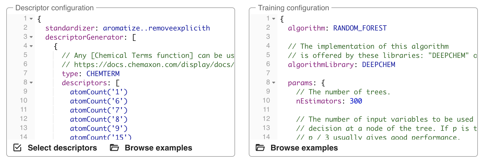 Choose the descriptor and training you want to apply from the lists of examples. The lists pop up after clicking on the Show examples part of the configuration windows.