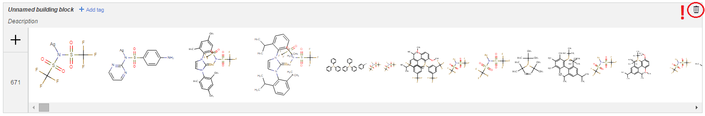 **Building blocks ** page is an internal collection that can contain several molecule lists, i.e., building blocks, and these blocks are accessible for all user. Only administrators can make changes on this page, such as creating new blocks, renaming them, adding tags and descriptions, adding structures to a block by drawing or by uploading from file, editing or removing molecules, or deleting existing blocks.