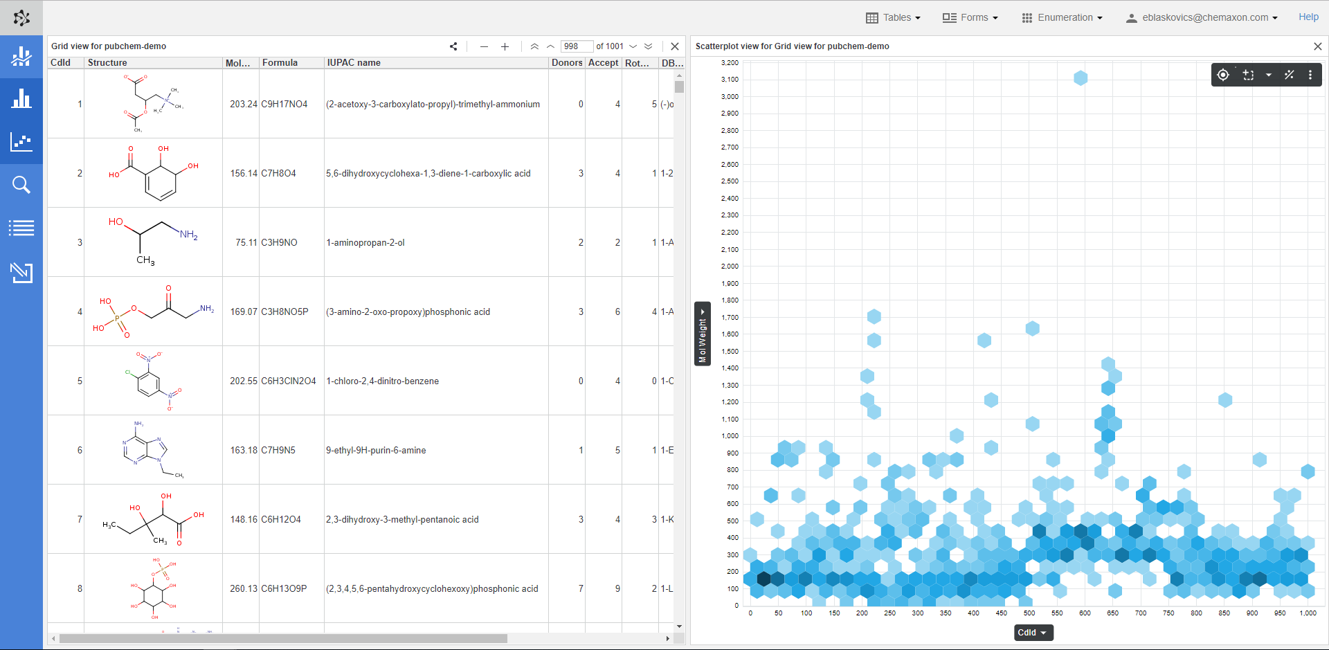 Data displayed in both Connect grid and form view can be visualized using an integrated component called Charts view. For instance, displaying molecular weight distribution within a data set as a histogram.