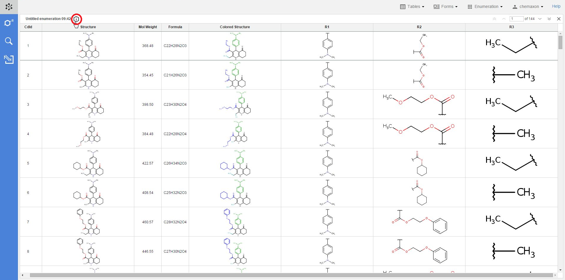 The new table will contain the following columns: the compound identifier (CdId) of the enumerated molecules, the structure, mol weight and formula of the enumerated structure, the respective substituent group for each R-atom, and the "colored structure", which corresponds to the coloring of the enumeration preview: the scaffold has black color while each R-atom substituent appears with a different color.
