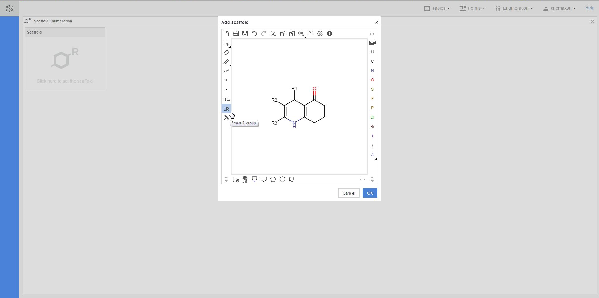 The first step in the preparation for an enumeration is to define the scaffold, i.e. the common part of the later enumerated compounds. If you click in the scaffold window, the Marvin JS editor will open, where you can either draw your scaffold structure or import it from file. Your scaffold has to contain one or more R-atoms, which will be substituted by different atoms or groups during the enumeration. You can learn more about drawing structures with R-atoms in the Marvin JS User Guide.