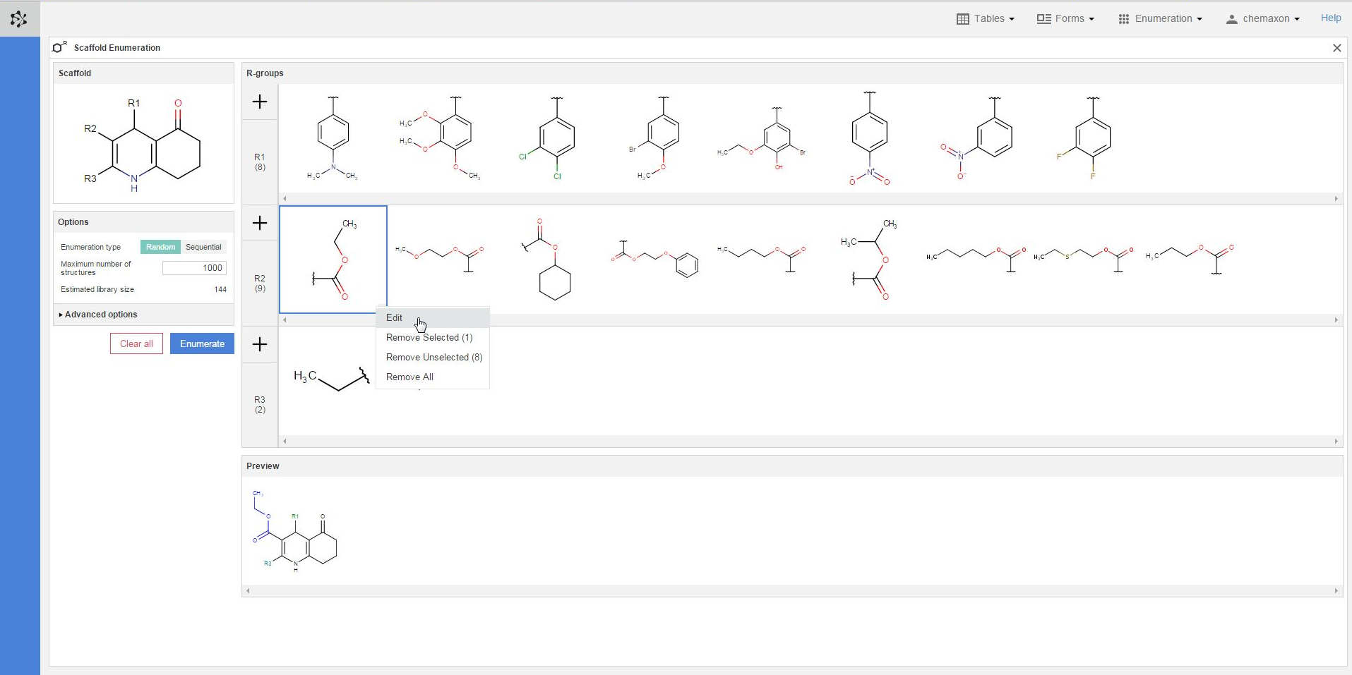In the preview pane, you can see a few of the molecules generated from the scaffold and the combinations of R-group definitions (substituents). The coloring of the preview molecules immediately reflects their constitution: the scaffold part is colored black, while each functional group substituting a different R-atom has its own coloring.