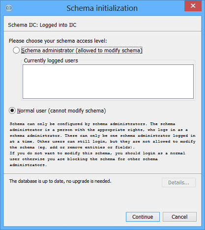 - To make 'structural' changes to the database you need to be logged in to the database as the schema administrator. If you have sufficient privileges then you will be prompted for whether you want to connect as the schema administrator. If you do you will prevent other users from connecting as the schema administrator. More normal users can be connected at the same time. Note that this is only valid for MySQL and Oracle, as the Derby database in IJC is not designed for concurrent access. You are always logged in as the schema administrator if you are using local Derby database.
