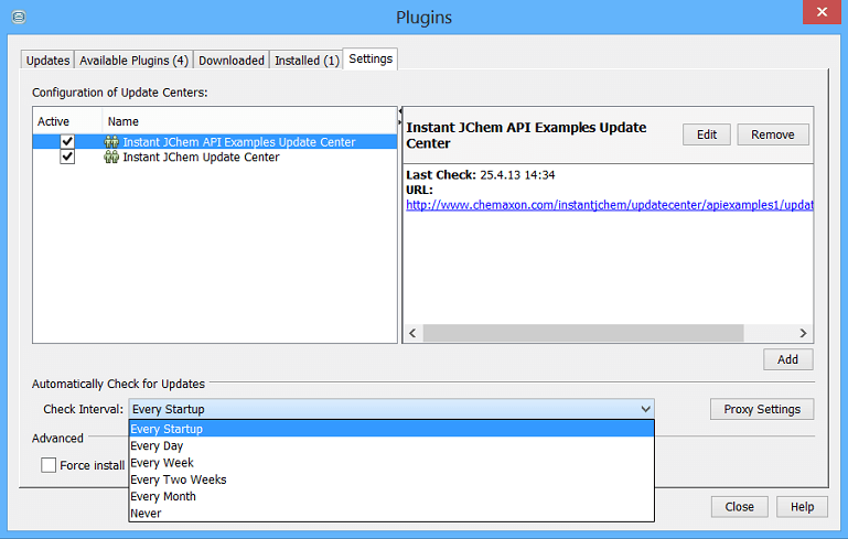 Specifies how often IJC checks for updates. Select a frequency from the drop-down list. Click Proxy Settings to set any proxy settings needed to access the update centers.