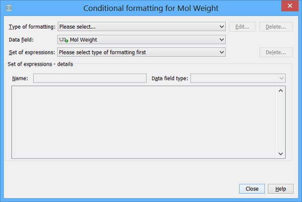 You could change the data field whose values are used to conditionally format our Mol Weight column. This allows you to format one column using the values of a different field. But we don't need that so we leave the data field unchanged.