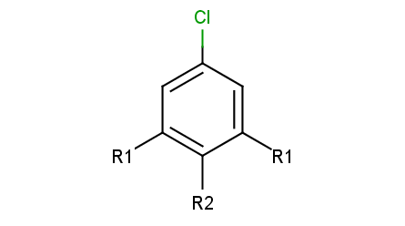 Note, that there are two R1atoms referring to symmetrical ligand positions. By default, this means that the matching ligands should be identical. You can change this behavior by setting the --RLigandEqualityCheck:nparameter, in which case the same RGroup ID is only used to denote symmetrical positions on the scaffold and different ligands at these positions are also accepted.