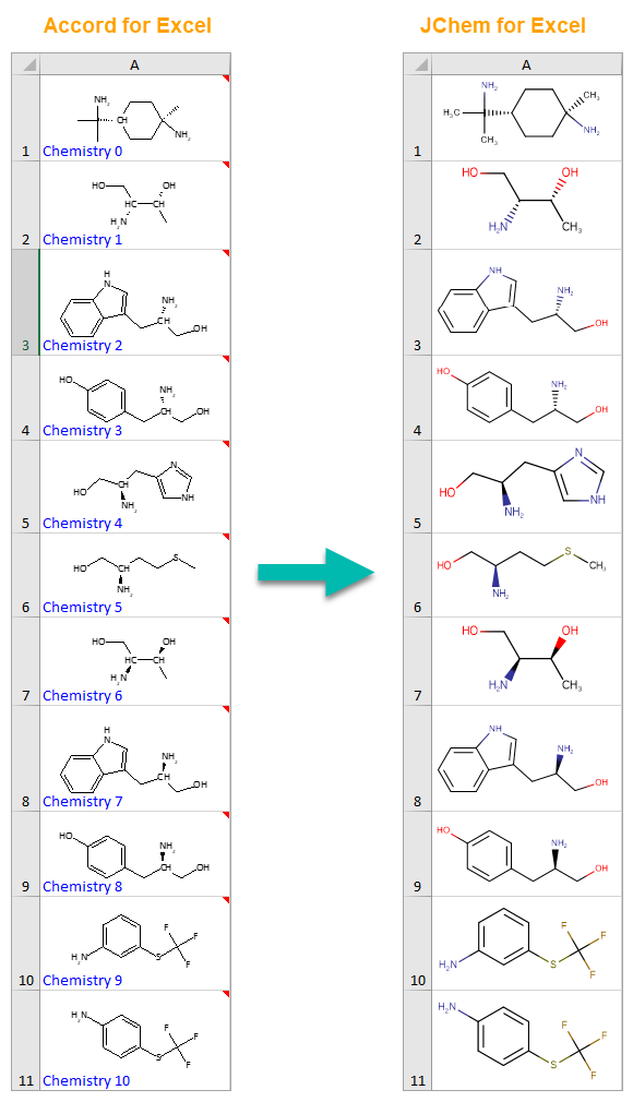 The figure below shows an Accord for Excel to JChem for Excel conversion.