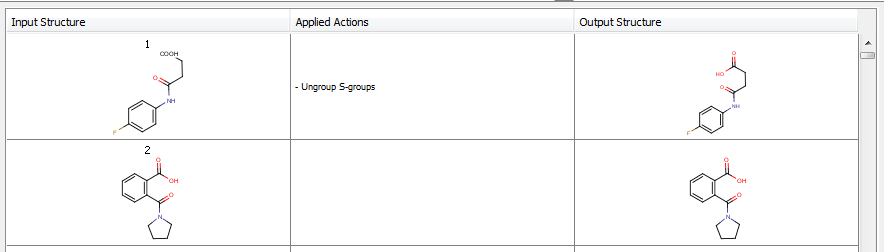 To compare original and standardized structures, press the Report tab in the bottom left corner. A detailed log is presented here showing input and output structures with applied actions: