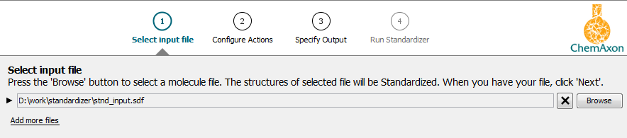 The Standardizer Application is an easy-to-use, high-end graphical user interface (GUI). This GUI allows you to reach all the functionalities of Standardizer without the need of using the command-line with parameters or editing configuration files manually. The Standardizer Application will provide you a friendly way to bring your molecules to a standardized form with guides for each task you may encounter.