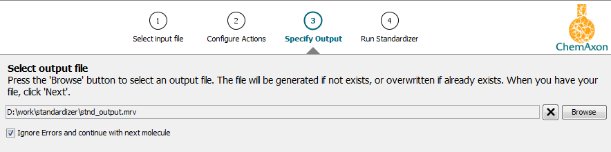 Click on the Browse button on the right side to set your output file. Note that every molecule of the input files appears in a single output file. Finding errors does not stop the procedure if you select Ignore errors and continue with next molecule.