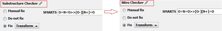 - Fixer: when the substructure is specified as reaction SMARTS or SMIRKS, the checker works as fixer as well.