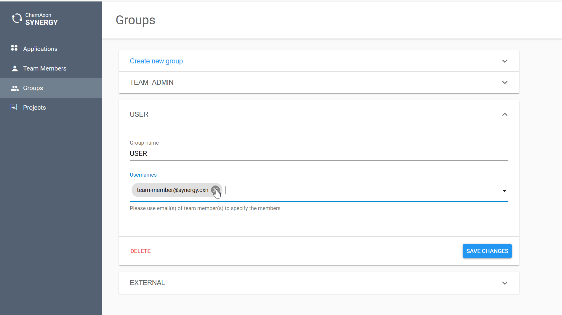 Groups in Synergy help you administer team members in different applications. Permissions are granted to these groups within the specific application. e.g. please refer to Chemaxon Assay Documentation.