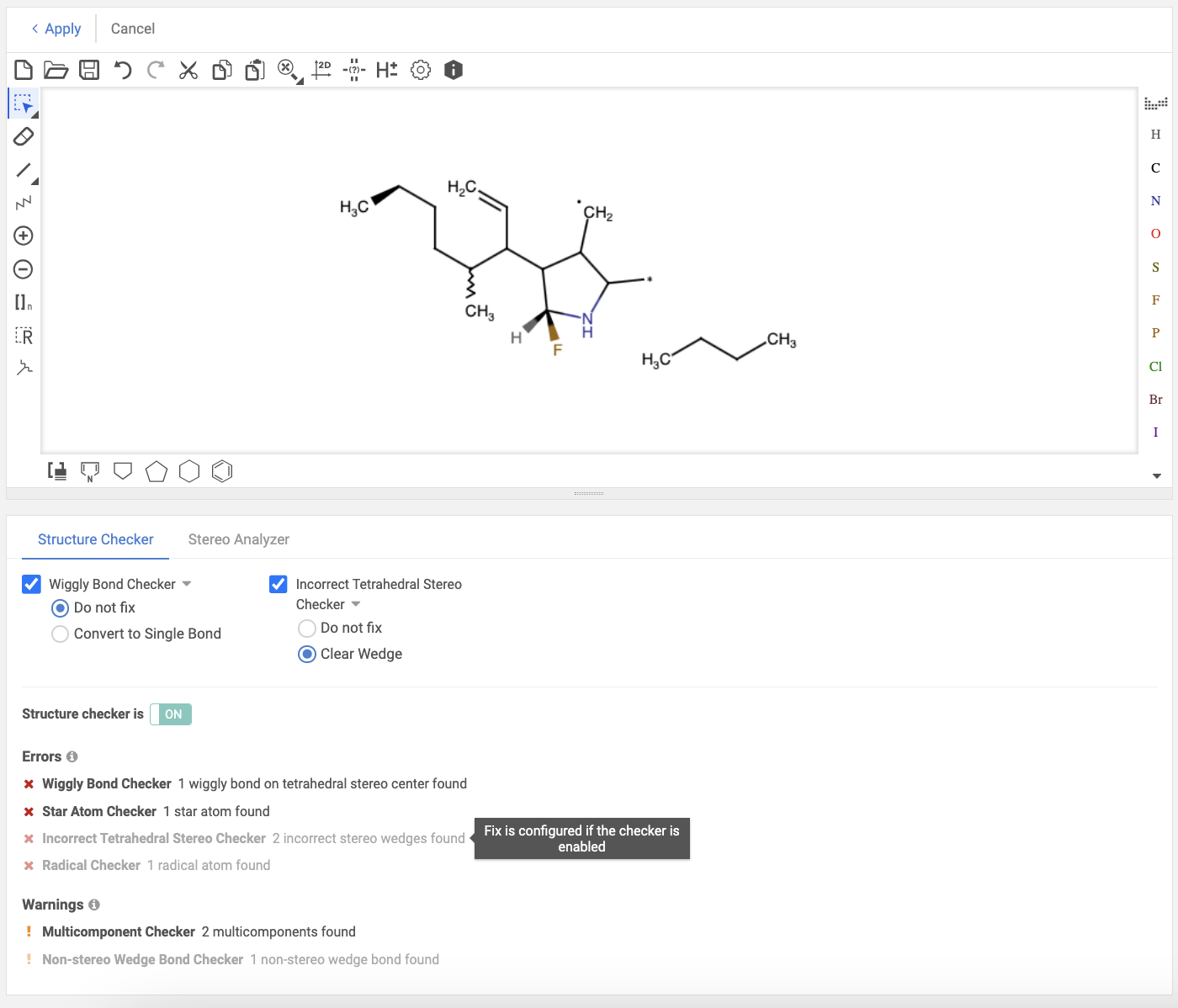Using the Stereo Analyzer option, stereocenters and stereo double bonds can be recognized. User can even automatically change structures by applying fixers to the molecule.