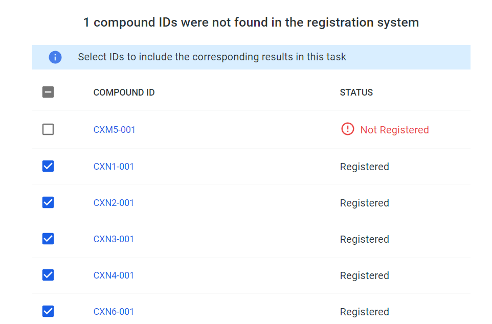 To include data to be uploaded, check the tickbox next to the compunds ID; to include all unregistered , select the checkbox in the header row.