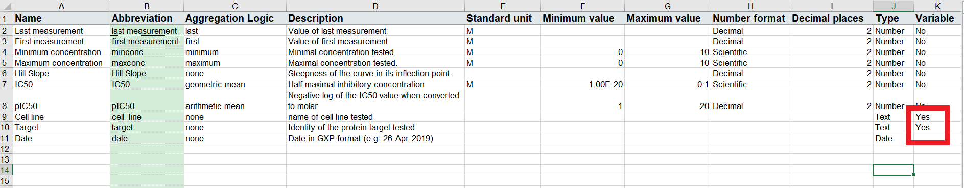 Using the variable result types allows one to visualise the assay conditions in the connected analysis application. Distinct aggregated values are generated for each unique combination of variables. In this case we see a single aggregated IC50 value for compound CXN1-002 for each cell line on two different targets.