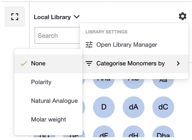To change or remove the monomer grouping on the library panel, click on the property’s name and select another property or ’None’ in the list.