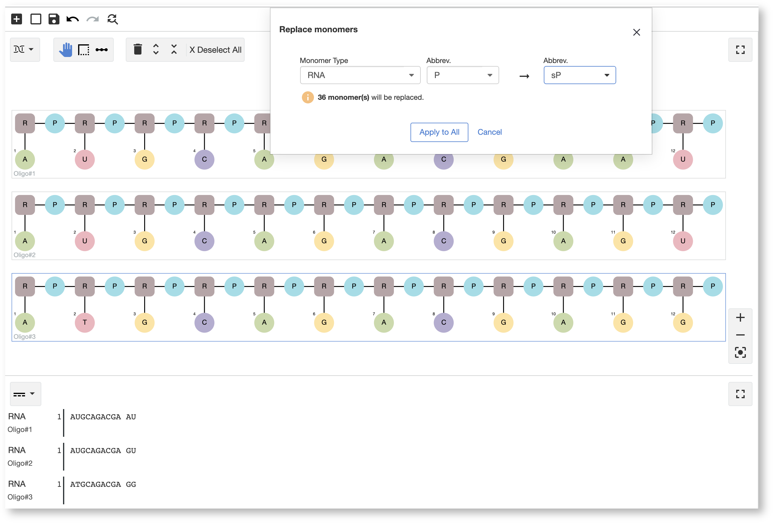 - Select the substituting monomer abbreviation and click "Apply to All"