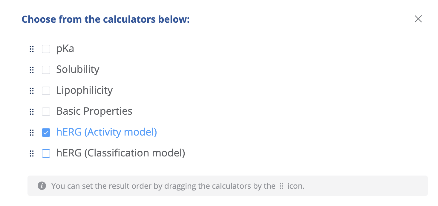 You can predict the hERG activity and the classification class in Playground by selecting the relevant model under the Explore Calculations menu.