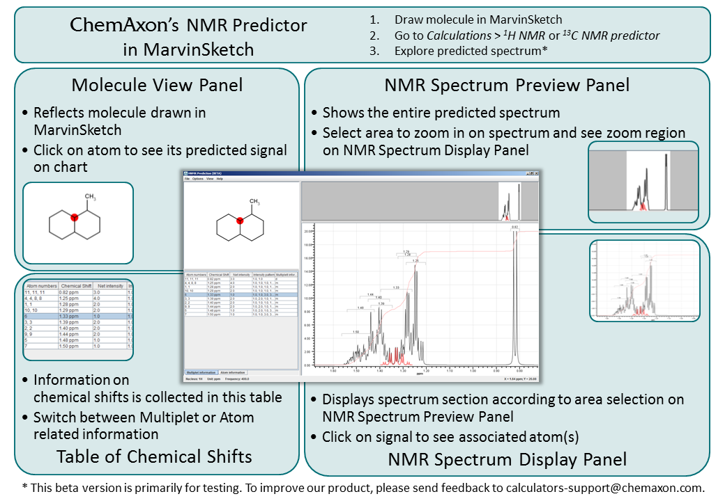 The picture below gives a quick overview on the capabilities of Chemaxon's NMR Predictor.