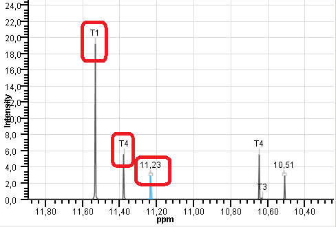 If you have added tautomers to the predicted spectrum via Select Tautomers... option and Spectrum Labels are on, the inactive tautomer signals are marked according to their symbols (T1, T2, ...).