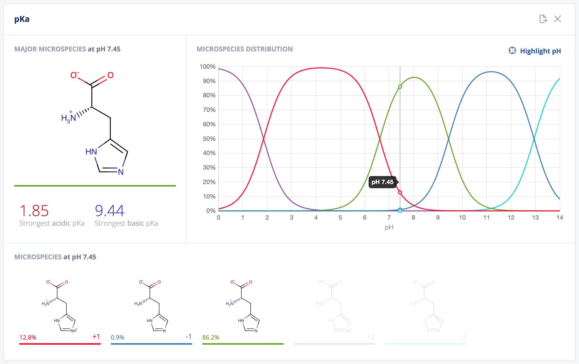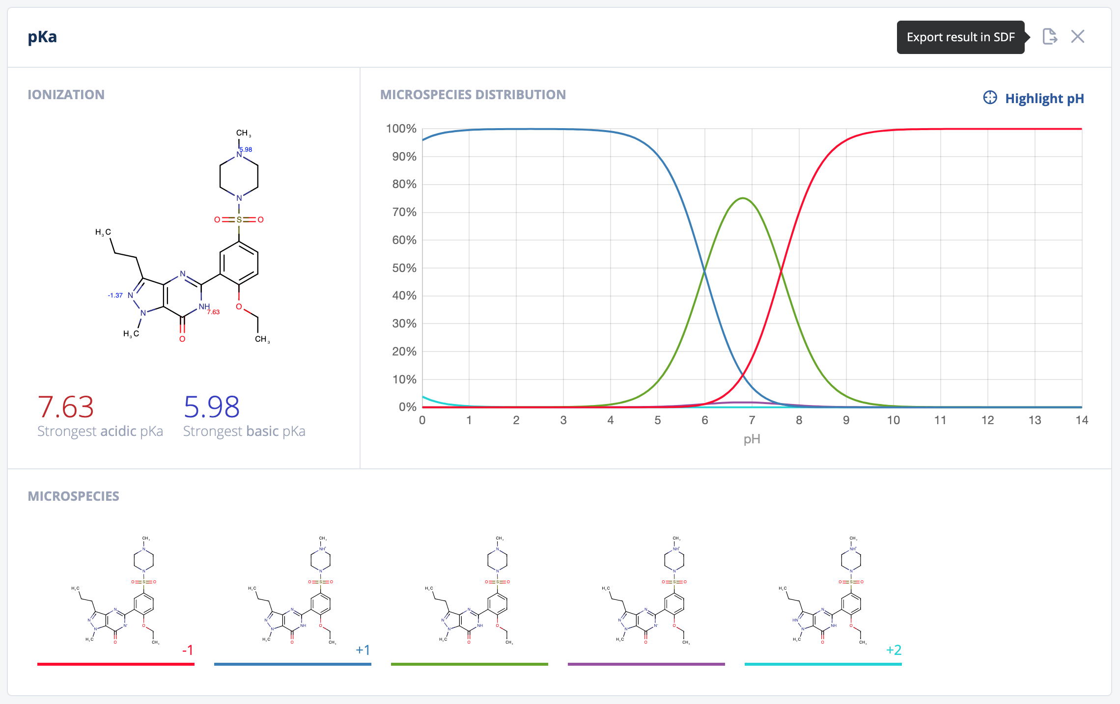 - Calculations related to ionization (pKa, microspecies distribution and major microspecies at a certain pH) are available.