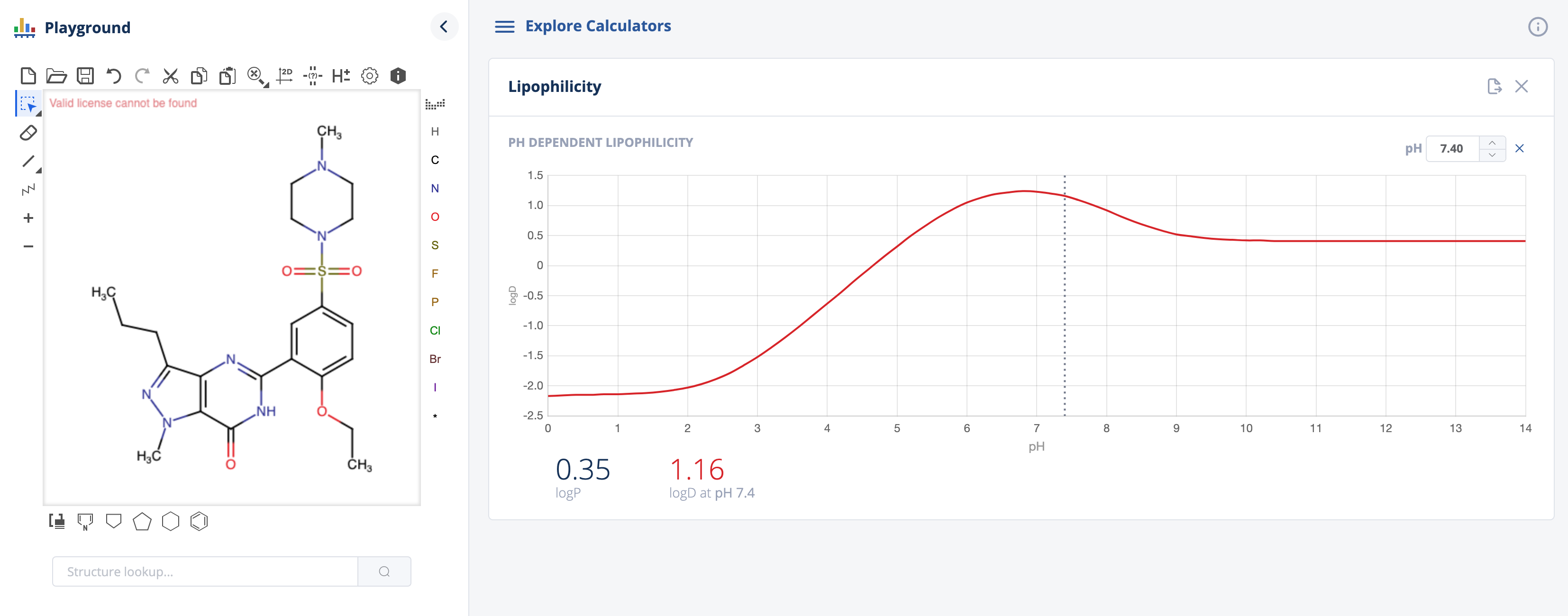 - Calculations related to lipophilicity (logP and logD at a certain pH value) are available.