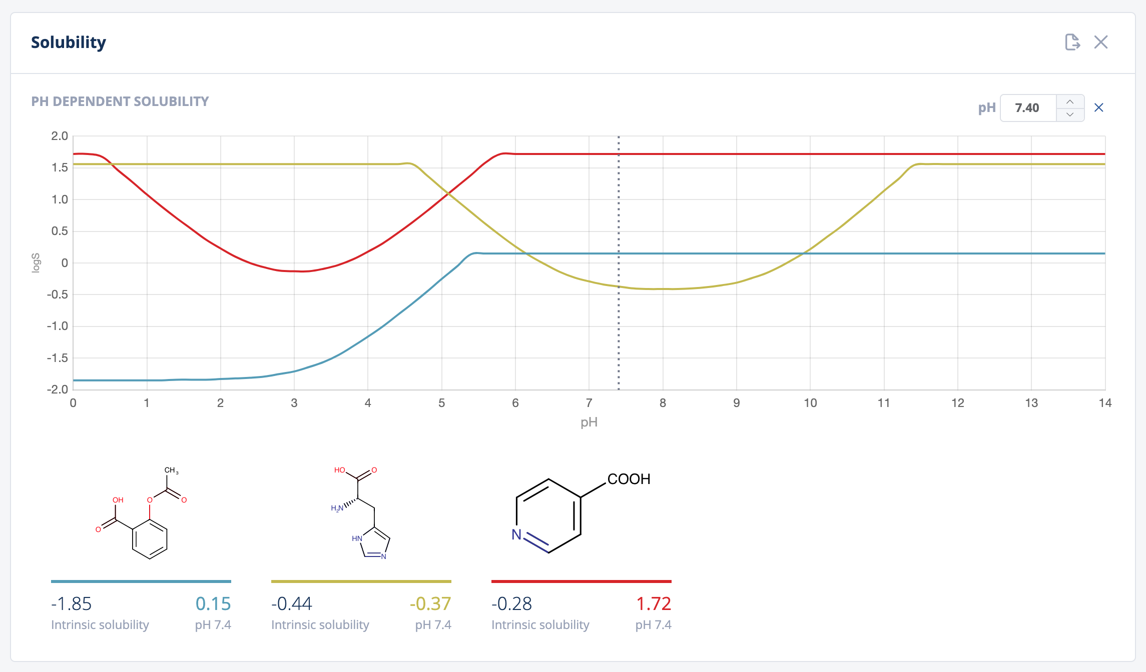 - Calculations related to aqueous solubility (intrinsic logS and logS at a certain pH) are available.
