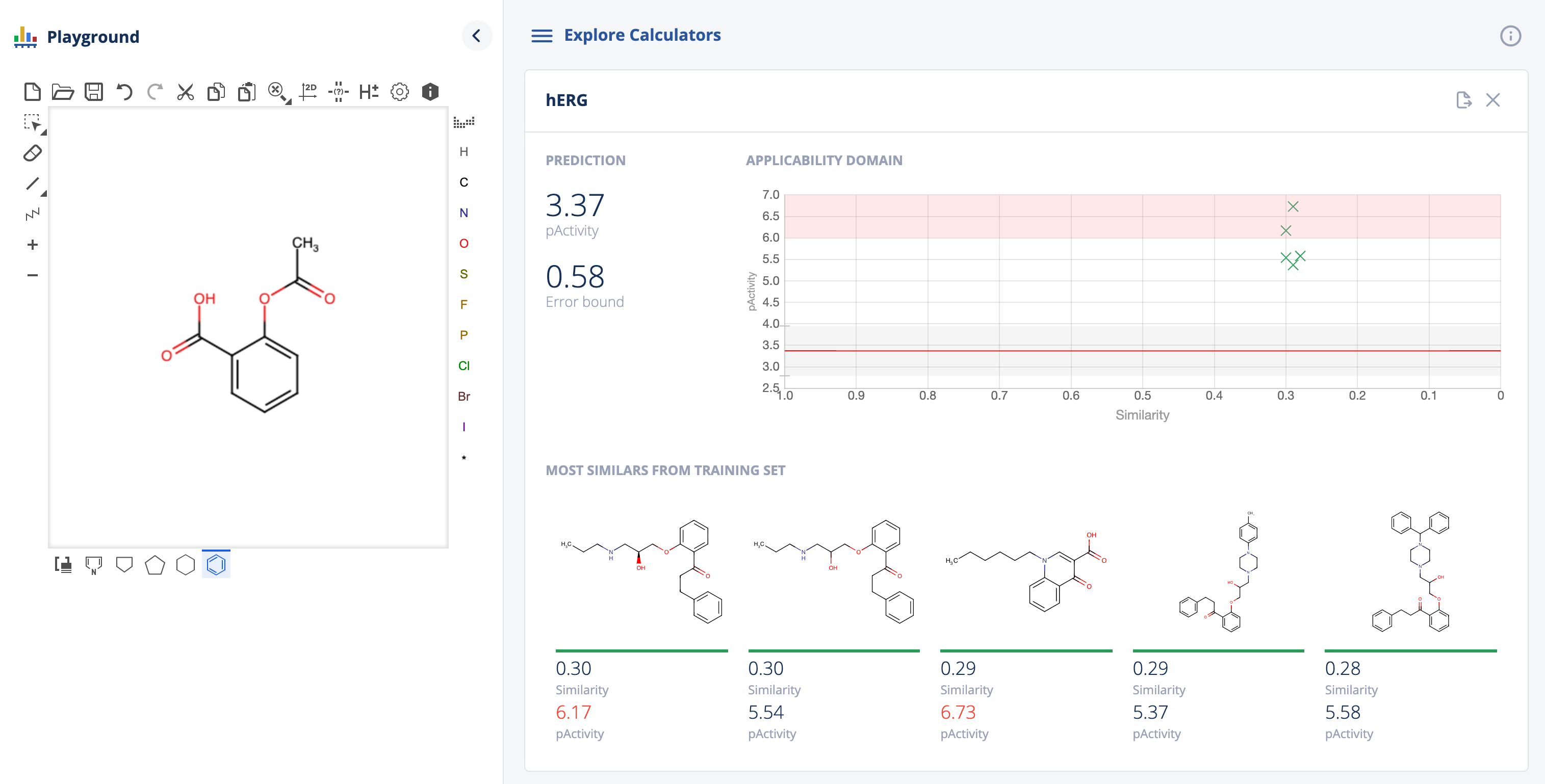The hERG window displays the predicted hERG pActivity value and its applicability domain. Scrolling through the most similar molecules from the training set, their position on the Similarity-pActivity chart gets highlighted.