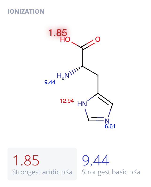 Hovering over a predicted pKa value, the given value gets highlighted next to its functional group in the molecule.