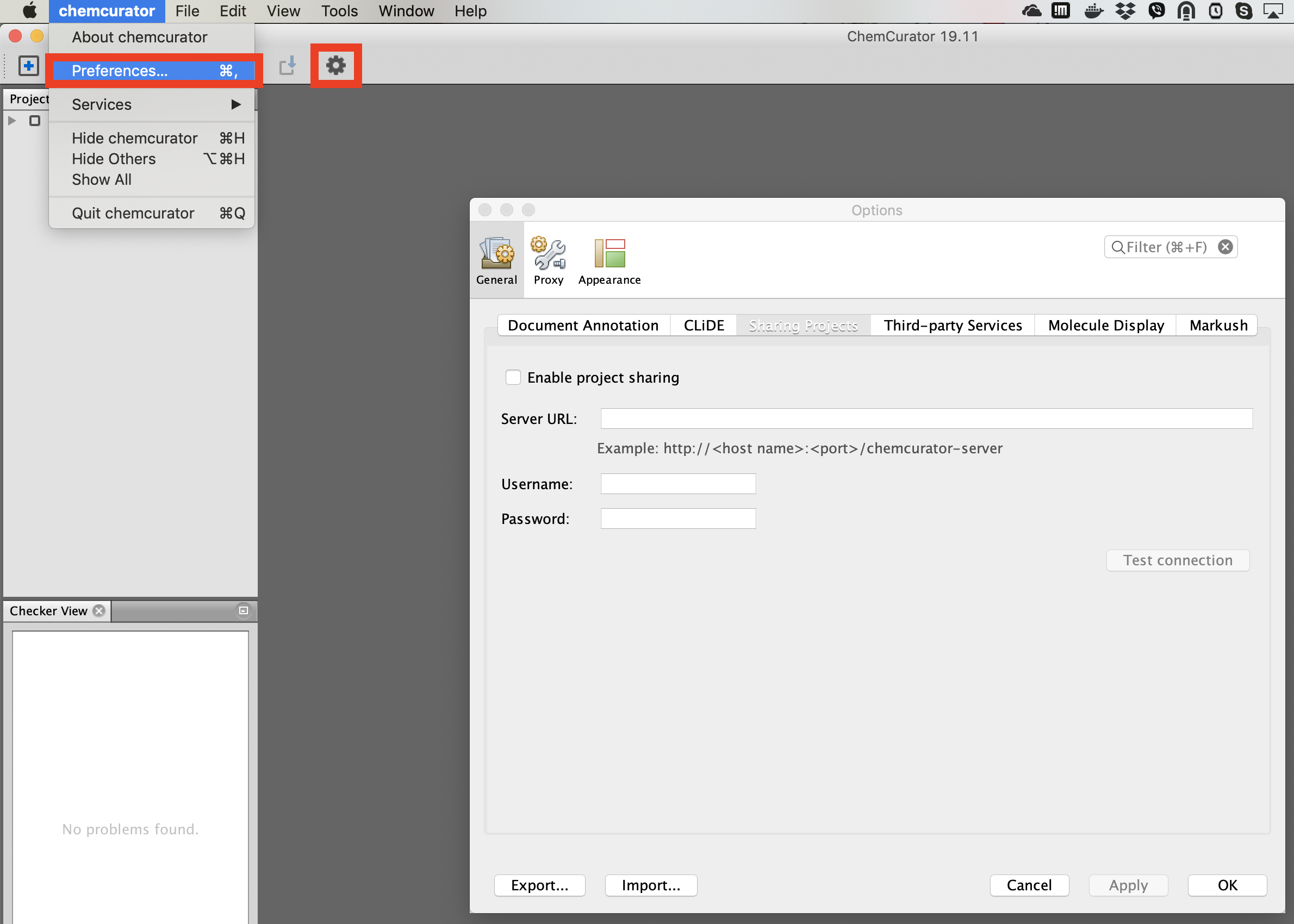 - Navigate to ** Tools / Options...** then Sharing Projects ** (on Mac machines: **chemcurator / Preferences... ). Alternatively, you can click on the Gear icon (highlighted in the picture below).
