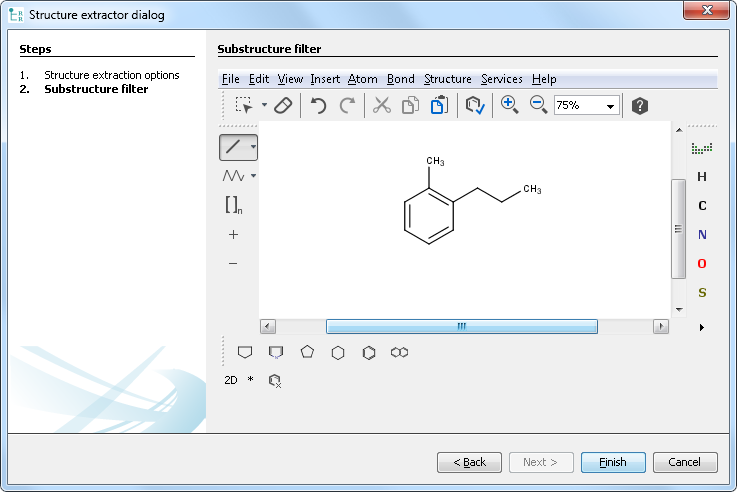 If Substructure or Similarity with threshold ** is selected, then clicking on the **Next button navigates to the second tab of the extraction wizard. In a case of Similarity with threshold , only exact compounds can be used as a filter without any variability. In a case of Substructure filter, however, atom lists, bond lists, and any query properties can also be used.